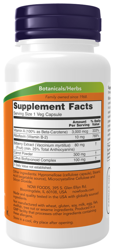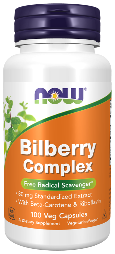 Черника (Vaccinium myrtillus) - это плод небольшого куста, родственного чернике, произрастающей в прохладном умеренном климате. Он использовался травниками на протяжении веков, и современные научные исследования показали, что черника обладает мощными свойствами нейтрализации свободных радикалов. Now Bilberry Complex - это стандартизированный экстракт черники с 25% антоцианов, дополненный морковным порошком и биофлавоноидами цитрусовых.