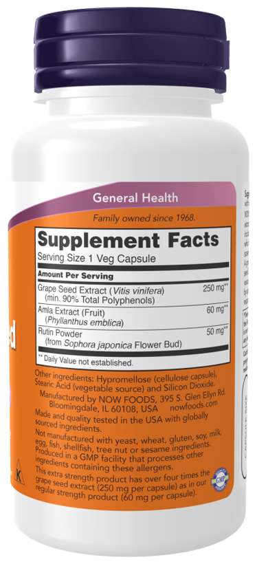 Экстракт виноградных косточек Now - это высококонцентрированный натуральный экстракт, содержащий минимум 90% полифенолов, включая олигомерные проантоцианидины (OPC), которые представляют собой мощные водорастворимые соединения, улавливающие свободные радикалы, содержащиеся в косточках винограда. Растущее количество исследований показывает, что ОРС виноградных косточек поддерживают здоровье сосудов, костей, почек, мозга и других тканей, обеспечивая здоровую, сбалансированную иммунную реакцию на окислительный и метаболический стресс.