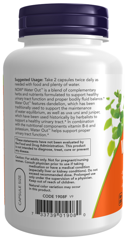 Средство Water Out - это смесь дополняющих друг друга трав и питательных веществ, разработанная для поддержки здоровой функции мочевыводящих путей и правильного баланса жидкости в организме. В состав Water Out входят одуванчик, который традиционно использовался для поддержания водного баланса, а также толокнянка обыкновенная и можжевельник, которые исторически использовались травниками для поддержания здоровья мочевыводящих путей. В сочетании с питательными компонентами витамином B6 и калием, Water Out помогает поддерживать правильную функцию мочевыводящих путей.
