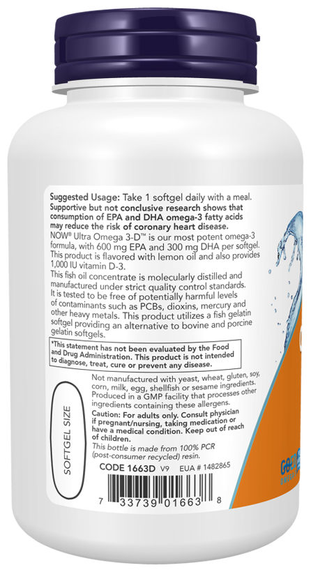 Ultra Omega 3-D от NOW - это наше самое мощное средство с омега-3, содержащее 600 мг ЭПК и 300 мг ДГК в каждой капсуле. Продукт содержит лимонное масло, а также 1000 МЕ витамина D3. Этот концентрат рыбьего жира производится в соответствии со строгими стандартами контроля качества. Он протестирован на отсутствие потенциально опасных загрязняющих веществ (например, ПХД, ртути, диоксинов и других загрязняющих веществ). В этом продукте используется капсула из рыбьего желатина, которая является альтернативой капсуле из говяжьего и свиного желатина.