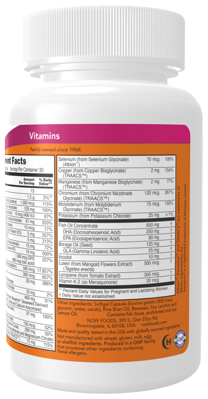 Омега-3 (из концентрата рыбного жира), карбонат кальция (из морских минералов красных водорослей), цитрат и аскорбат кальция, натуральное масло лимона, соевый лецитин, масло бурого риса, пчелиный воск (Е901), оксид магния, магний из морских минералов красных водорослей, цитрат магния, бисглицинат железа, масло из семян бурачника, аскорбиновая кислота, бисглицинат цинка, d-альфа-токоферола ацетат, хлорид калия, d-пантотенат кальция, бисглицинат меди, никотинамид, холина битартрат, инозит, пиридоксина гидрохлорид, бисглицинат марганца, аминохелат хрома, тиамина гидрохлорид, рибофлавин, бета-каротин, фолиевая кислота, аммония молибдат, лютеин, ликопин (из экстракта томатов), биотин, йодид калия, селенометионин, фитоменадион, метилкобаламин, холекальциферол, желатин, глицерин (Е422), вода, камедь рожкового дерева (Е410) |